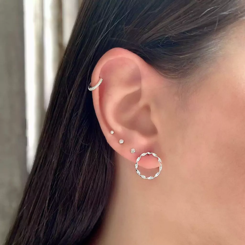 Brinco em formato redondo entrelaçado trazendo sofisticação e glamour. Peça que deixa um look moderno e elegante.